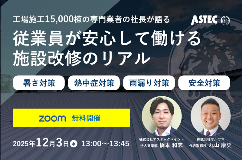 | 講演者 | 株式会社アステックペイント 法人営業部 係長 橋本 和志 BtoC業界のフィールドセールス、 BtoB業界のマーケティング支援を経て 2024年にアステックペイントへ入社。 現在は「塗装会社様の営業支援」「法人顧客の開拓」「業務提携会社の選定」等を担当。 施工店のネットワークをもって、全国の工場・倉庫など法人施設の改修の施工店紹介を実施。 また、自ら工場倉庫へ赴き、現場での施工提案も実施。 株式会社マルヤマ 代表取締役 丸山 康史 愛知県の大手自動車メーカーのエンジン設計にて サラリーマン時代を過ごす。 父親の塗装店独立をきっかけに、 塗装の道に興味を持ち、建設業界に入る。 2005年に株式会社マルヤマを立ち上げ、 2026年9月で創業20年を迎える。 現在は、世界でも最高水準と言われる 工場内の「カイゼン」に取り組まれている。 大手自動車メーカーに毎週出入りし、 年間100日間の施工に携わる。 その実績をもとに、施設改修のあらゆるお悩み解決を実現。 |