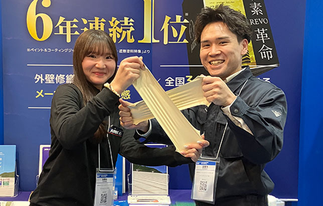 こちらの塗料は約600%も伸ばすことができ、ご来場いただいた皆様には実際に塗料を手に取って伸ばしていただき、その効果を実感していただきました。