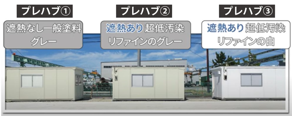 弊社アステックペイントの関東工場に、同サイズのプレハブ小屋を3棟設置し、遮熱塗料と一般塗料を塗装し、遮熱効果検証試験を行いました。